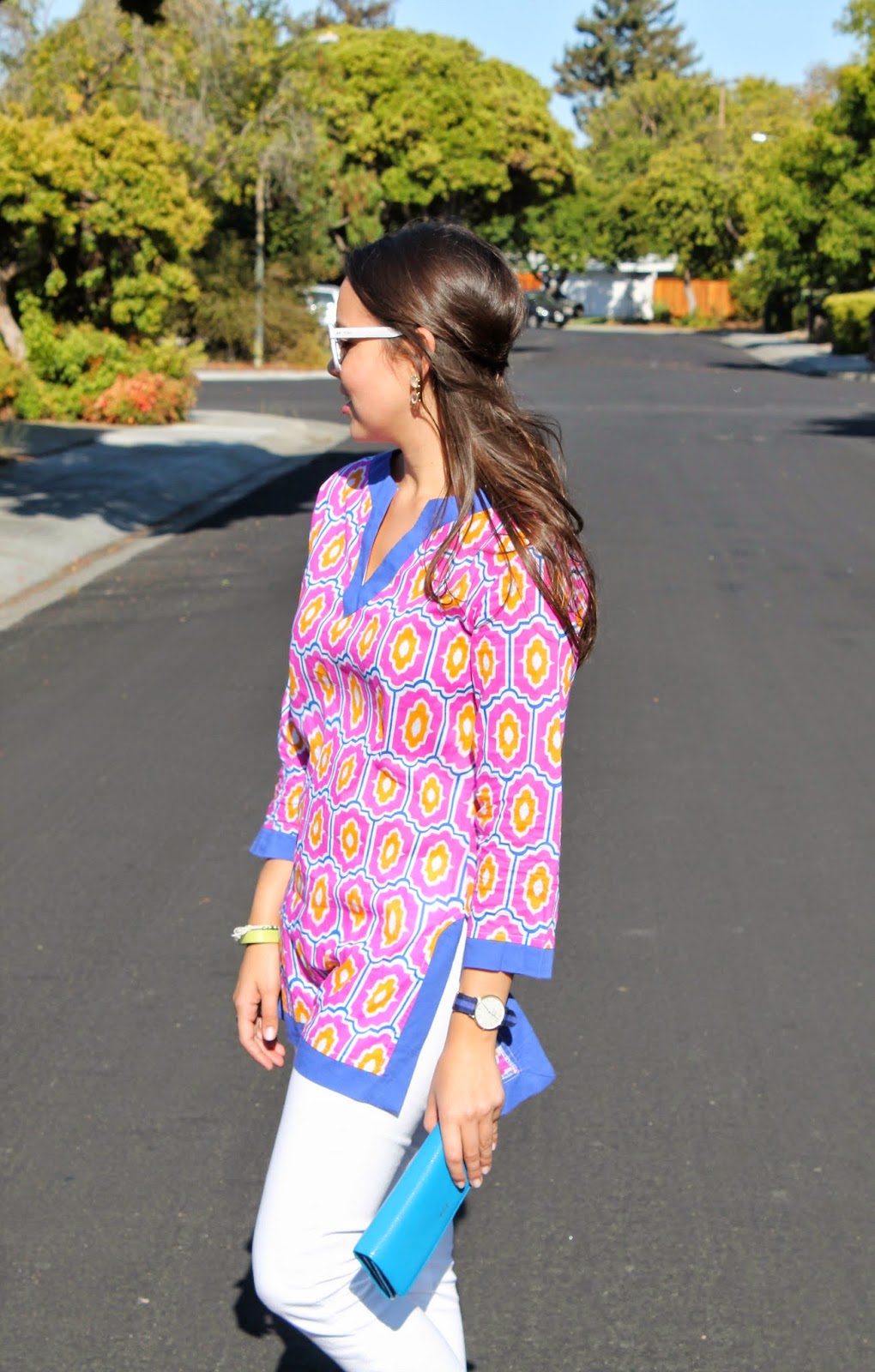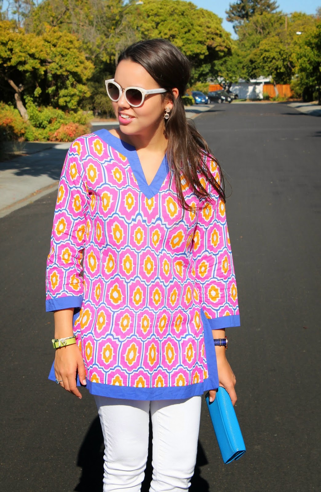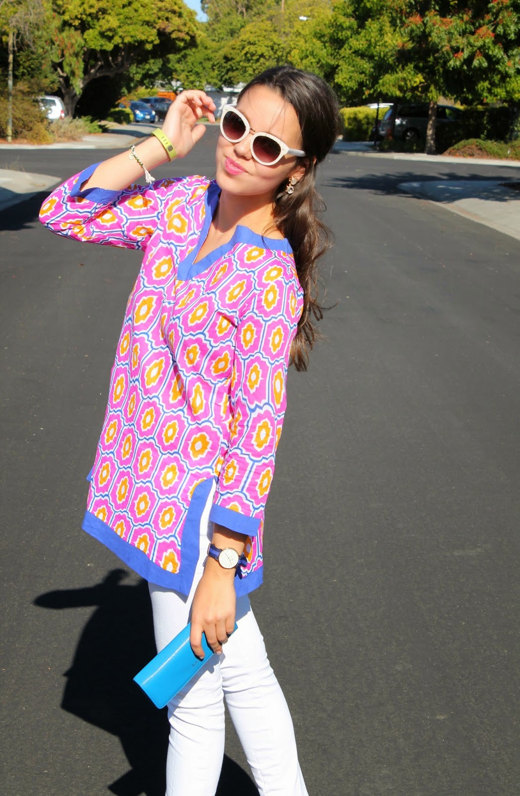 Tunic: All For Color c/o // Jeans: Paige // Shoes: Tory Burch // Sunglasses: Toms (white no longer available, champagne color here)// Clutch: Graphic Image (wristlet version) // Earrings: Asha (almost identical) // Watch: Daniel Wellington // Ring: David Yurman // Etc: Fitbit Flex
