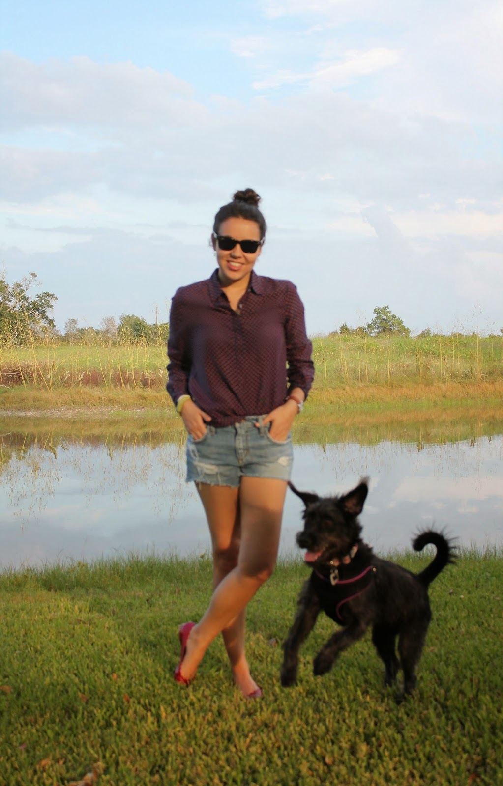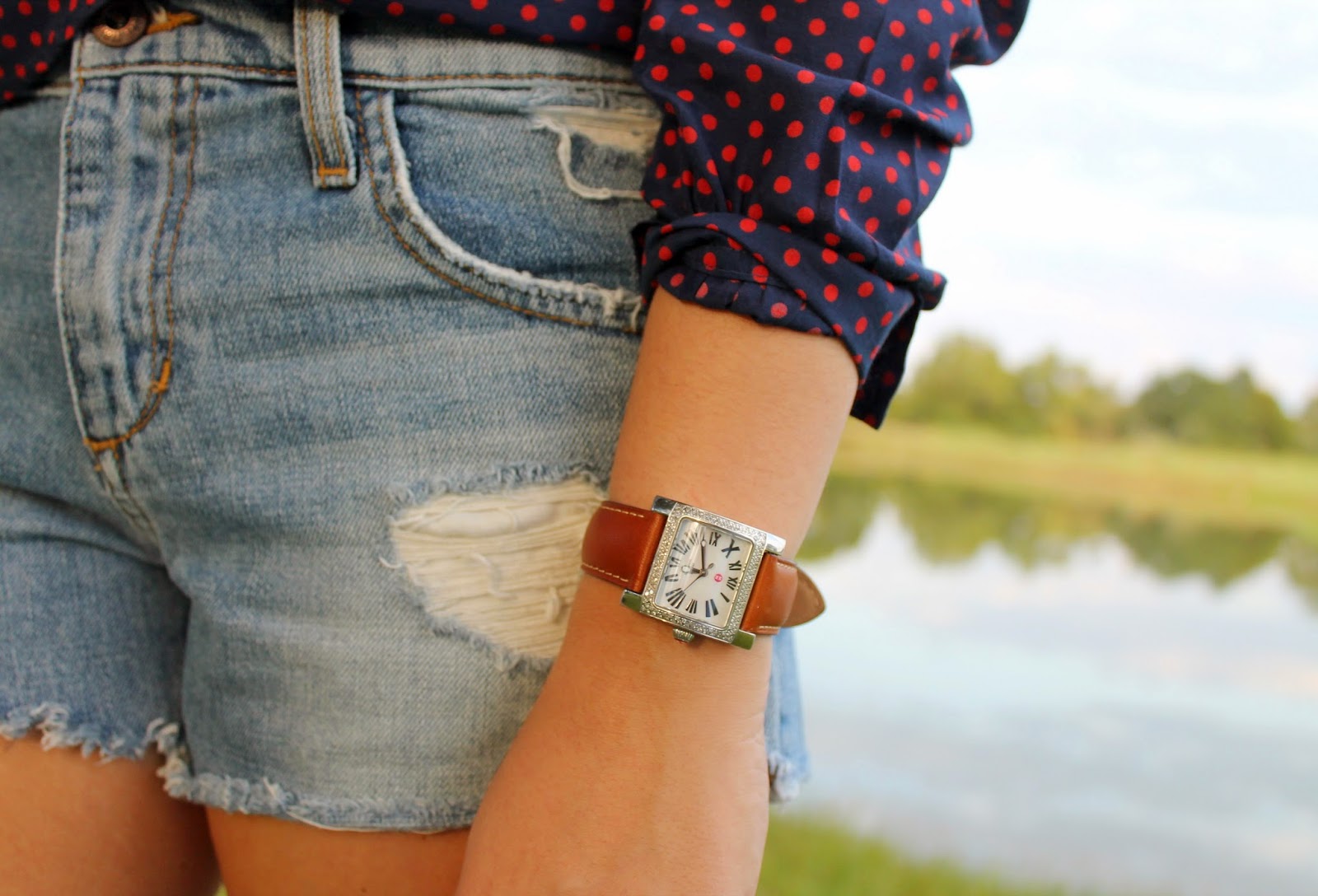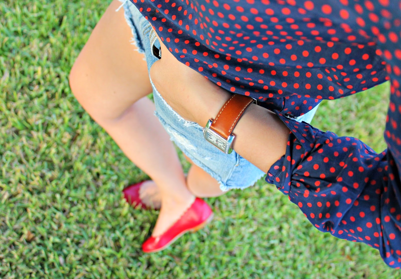 Shirt: J.Crew Factory // Shorts: Joe’s Jeans // Flats: Chloé // Sunglasses: Ray-Ban // Necklace: Golden Thread // Earrings: Saks (similar) // Watch: Michele (with Michele interchangeable band) // Bracelets: David Yurman; Fitbit Flex // Ring: David Yurman