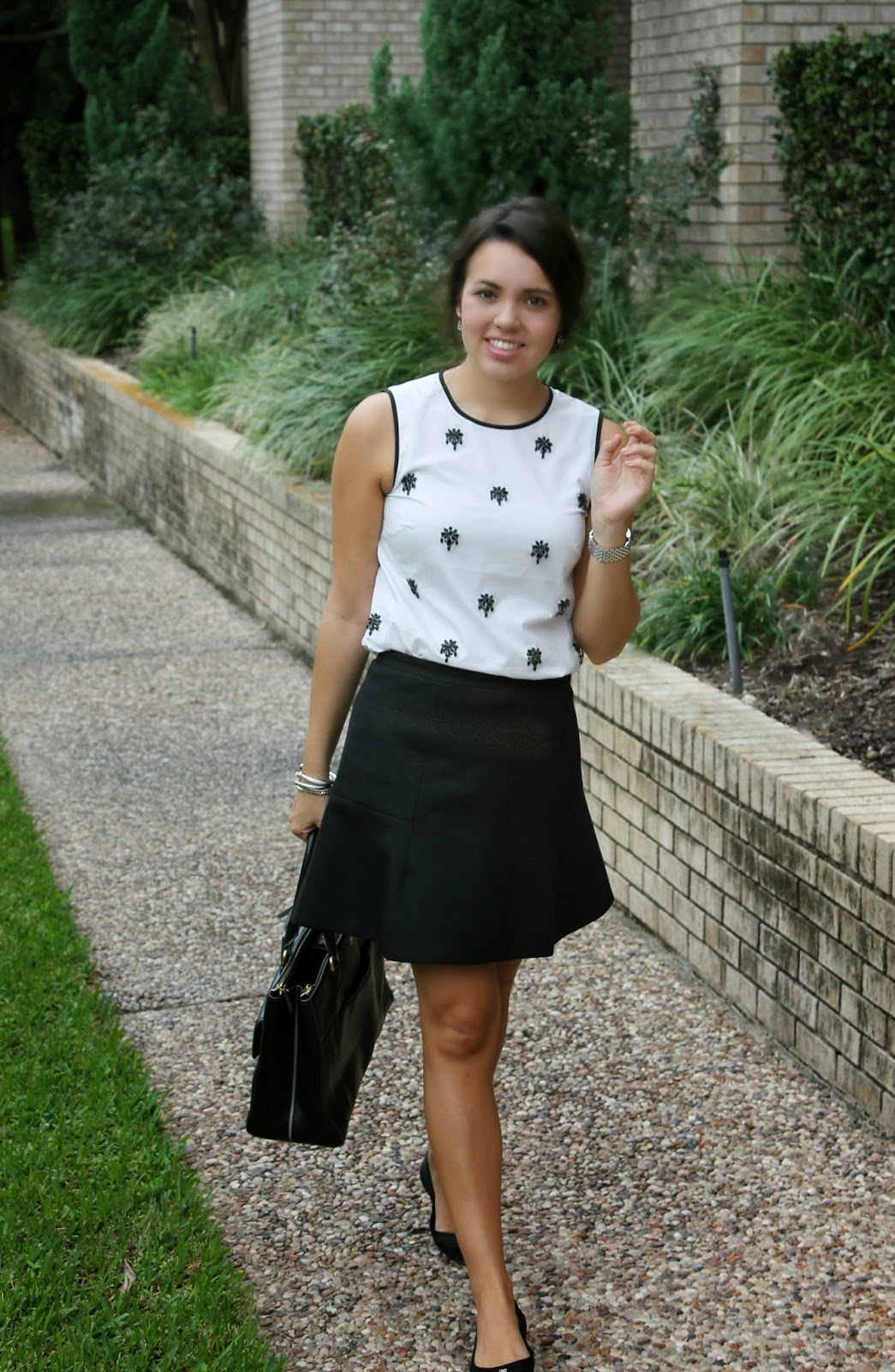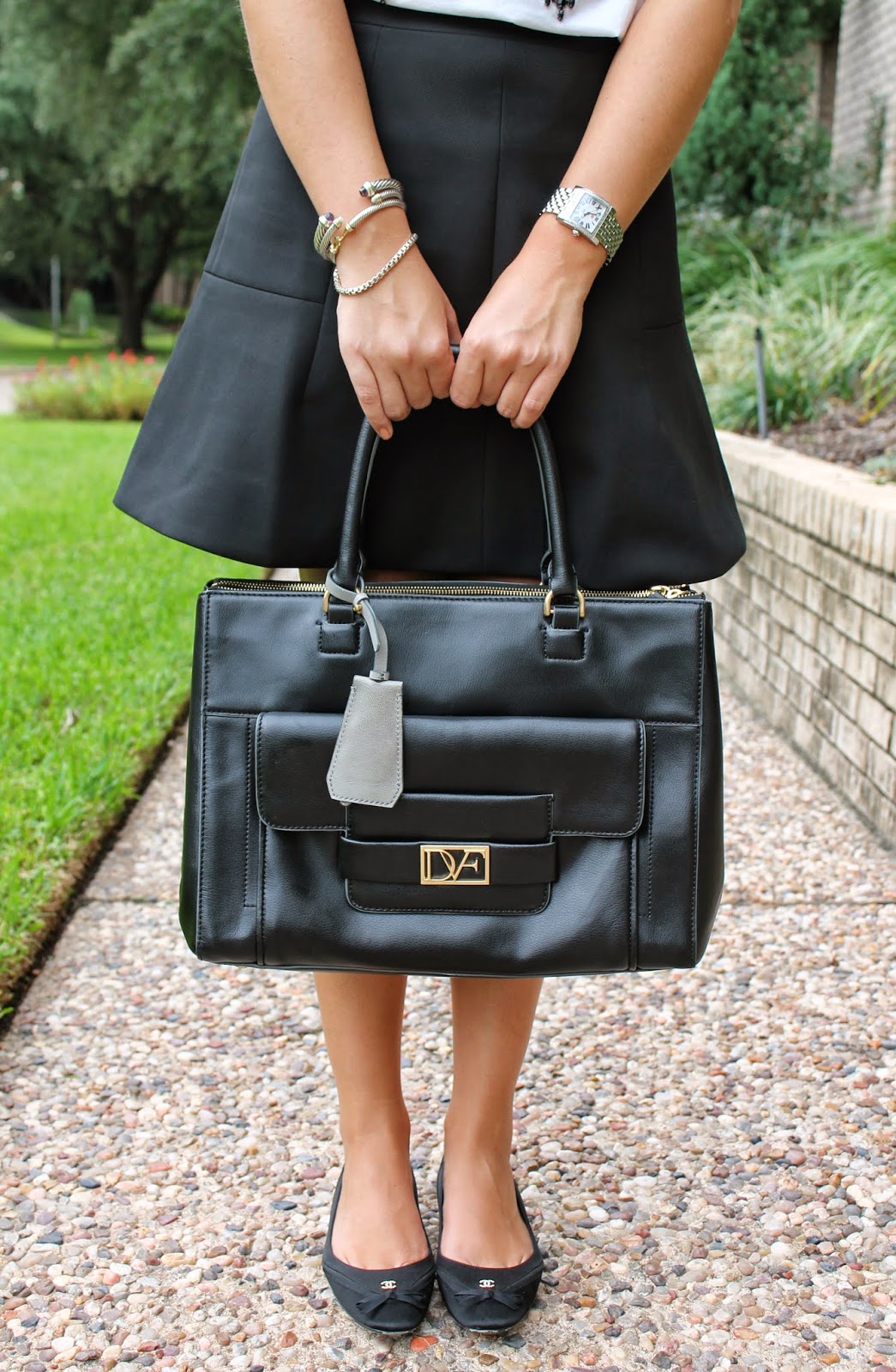 J.Crew jeweled sateen shell // J.Crew fluted skirt in double crepe // Chanel flats // Diane von Furstenburg top handle tote (similar) // David Yurman amethyst and pearl bracelets, buckle bracelet // Tiffany & Co. Venetian link bracelet // gifted Michelle watch & diamond earrings