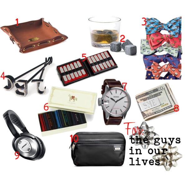 1. Colonel Littleton No. 3 dresser caddy / 2. Whiskey stone set / 3. Southern Proper beau ties / 4. Steak branding iron / 5. Personalized hidden message collar stays / 6. Ted Baker striped sock gift pack / 7. Nixon ‘the Chronicle’ watch / 8. Engraved money clip / 9. Bose noise canceling headphones / 10. Tumi Alpha…