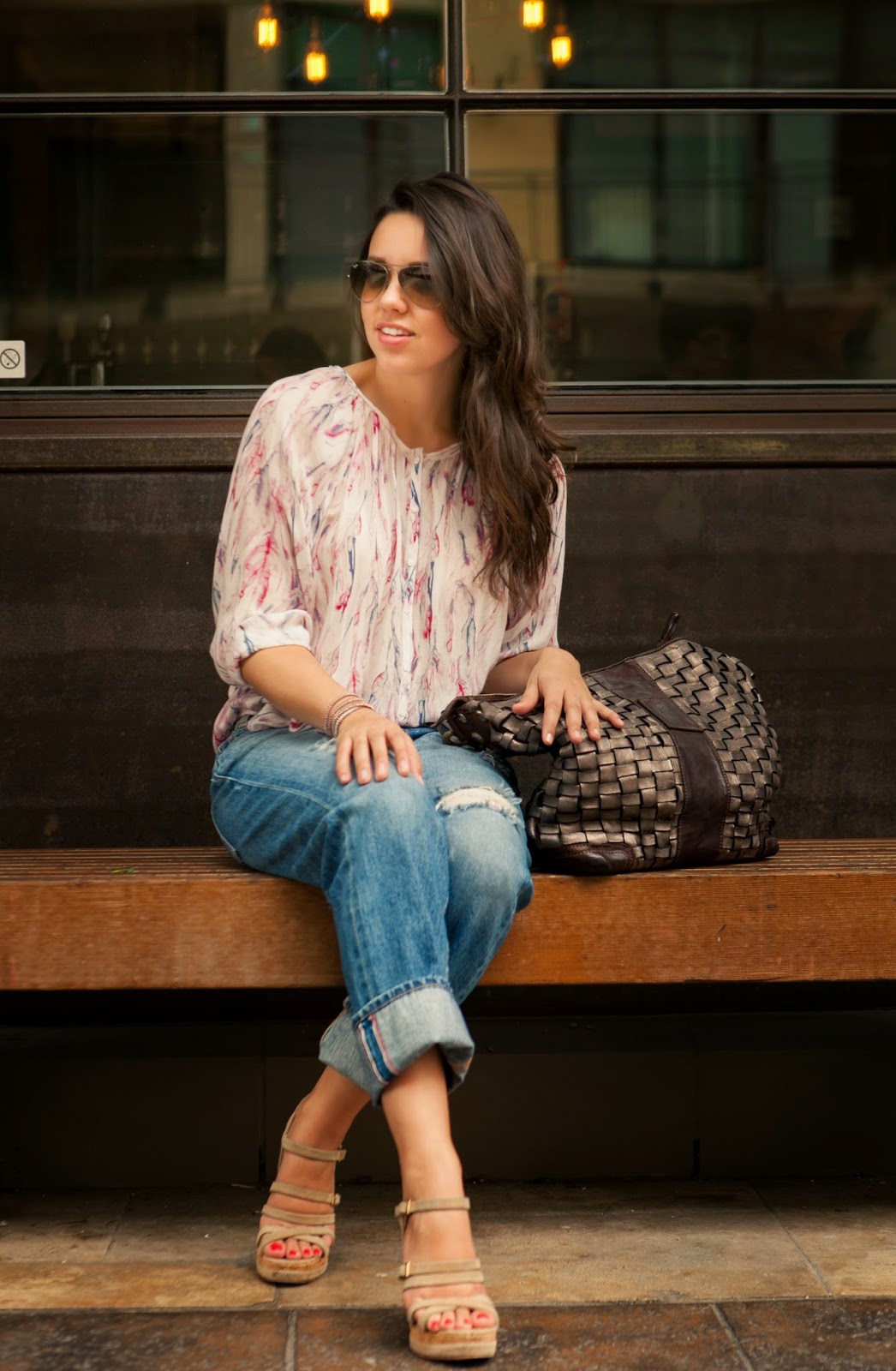 Well ladies, I’m pretty sure I’ve found the perfect pair of boyfriend jeans; just the right amount of distressed with the perfect relaxed fit. One of my favorite things about the masculinity of a boyfriend jean is pairing them with feminine and flirty tops or jackets. I had never heard of the brand Swildens until stopping by Sam and Lilli last month. I was immediately attracted to the feathery, watercolor print of the pastel top. Pairing my feminine top, masculine denim detail along with a gorgeous and roomy handbag was a no brainer. I’m usually caring a number of goodies inside my bag – whether it’s my laptop or iPad, my personal Graphic Image NY agenda or Erin Condren life planner to keep up with my blog editorial calendar, I’m usually running around with a full purse.