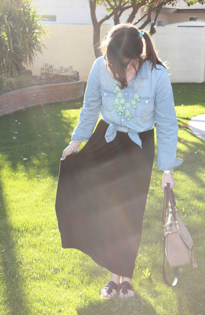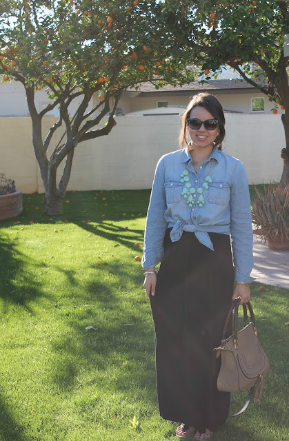 Gap maxi dress (love this one and this) // J.Crew Chambray shirt // Jack Rogers Navajos // Gifted turquoise bubble necklace // Initial Reaction monogram necklace // Anthropologie sunnies // Six Degrees hair tie // Lee Brevard earrings // Chloe Marcie satchel // Michele Mini Urban watch // David Yurman amethyst cuff