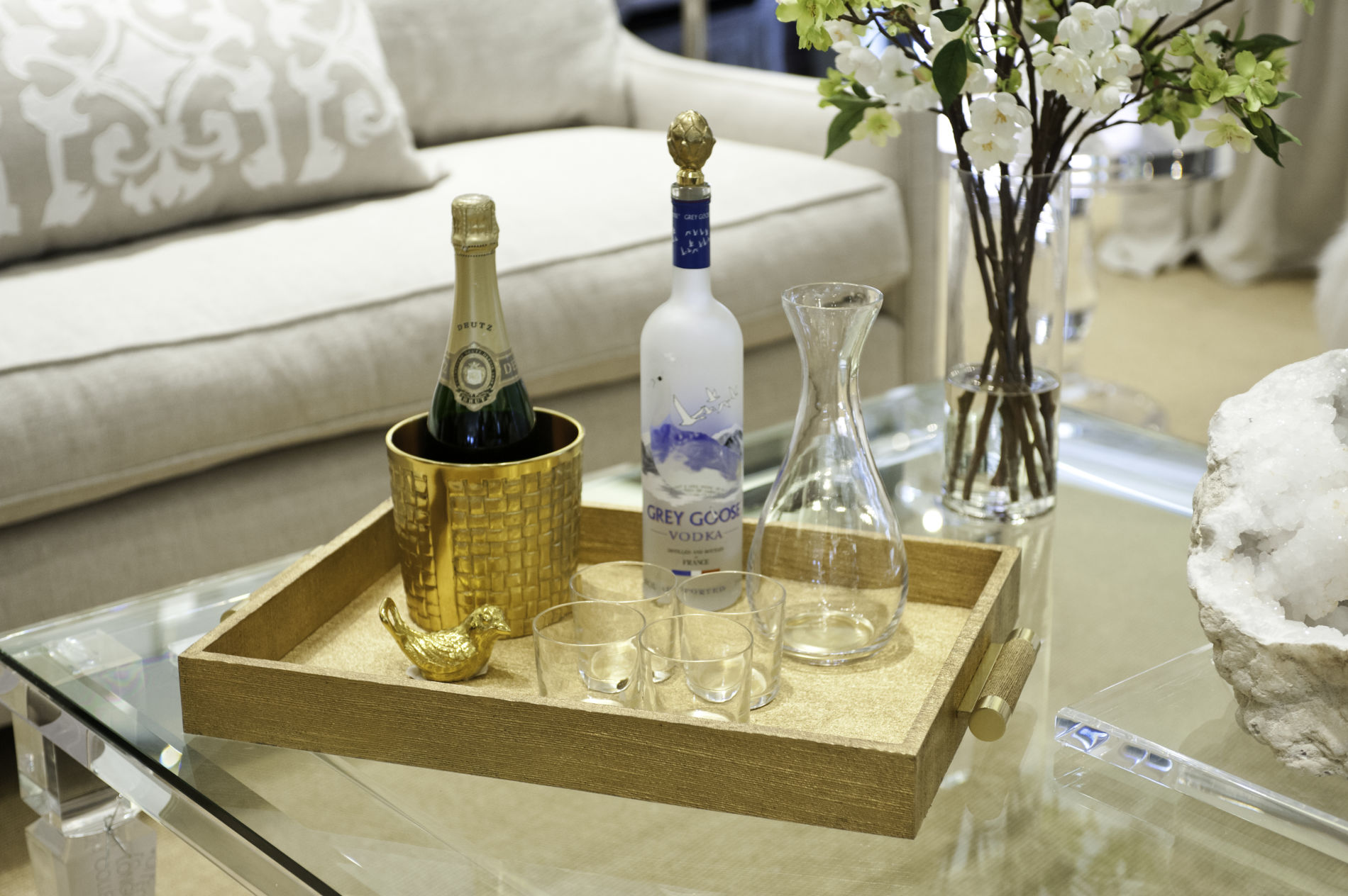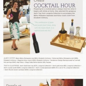 Top: Bibhu Mohapatra // Skirt: Bibhu Mohapatra (similar dress version) // Clutch: Kotur; all via Elizabeth Anthony in Uptown Park // Earrings: Henderson Design via High Gloss // Bracelets: via Longoria Collection // Heels: Christian Louboutin // Lipstick: Diego Dalla Palma via Facade // Aerin Tray, dove bottle opener, carafe, glassware, cachepot: Aerin; all via Longoria Collection