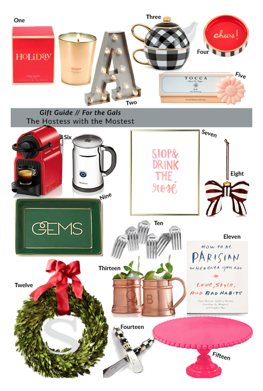 1. Henri Bendel candle $30 // 2. Nordstrom letter light $34 // 3. C. Wonder tea for one set $48 // 4. Henri Bendel bottle coaster $28 // 5. Tocca soap set $24 // 6. Nespresso Inissia bundle $250, $149 // 7. Evelyn Henson print via Design Darling $24.50 // 8. Henri Bendel stripe bow ornament $24 // 9. C. Wonder gems trinket tray $20 // 10. C. Wonder fork cheese marker set $28 // 11. How to be Parisian Wherever You Are book $25 // 12. Mark & Graham initial myrtle wreath $99 // 13. Mark & Graham copper mug $30 // 14. MacKenzie-Childs courtly check canapé knife set $60 // 15. Design Darling cake stand $42