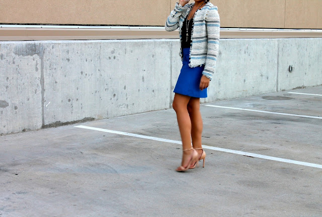Zara tweed jacket (love this Rebecca Taylor version!) // J.Crew silk cami // Zara mini skirt (skort version) // Zara nude ankle strap sandal // boutique tassel necklace // MAC lipstick in Russian Red