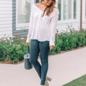 I’m a big fan of the fatigue utility jacket for transitioning otherwise summery pieces for fall. The olive color is perfect for the season and the jacket is still lightweight enough but provides some warmth when needed. You can see previous ways I’ve styled my fatigue jacket in this post and this one.
