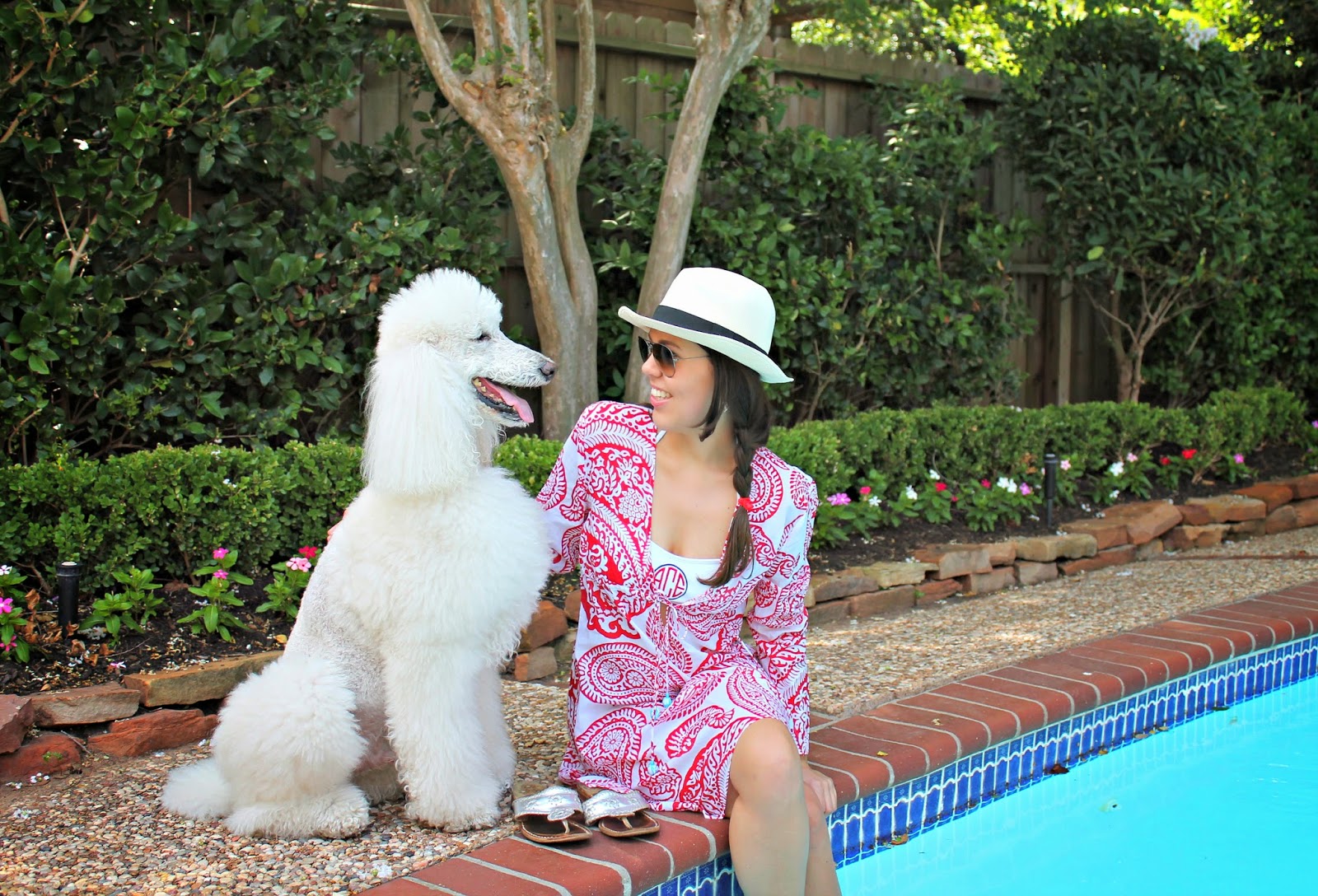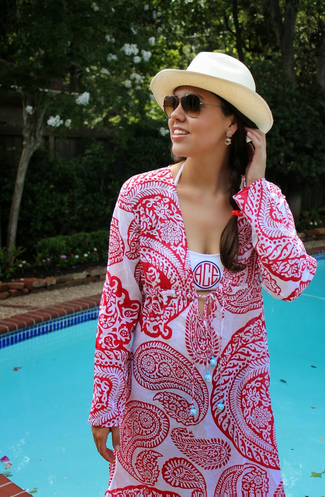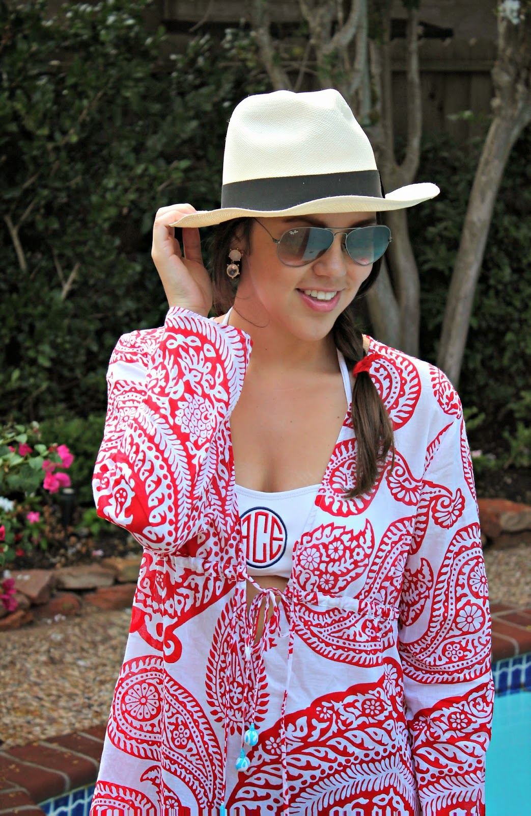 Love the hat paired with that beautiful cover up! I have a weakness for monograms too, especially in jewelry.
