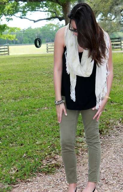 Vince tank // Noma zig zag tassel scarf c/o // J.Crew toothpick denim (similar) // Fit In Clouds flats c/o // Ray-Ban Wayfarers // Initial Reaction monogram necklace // By Erin Gordon bracelets