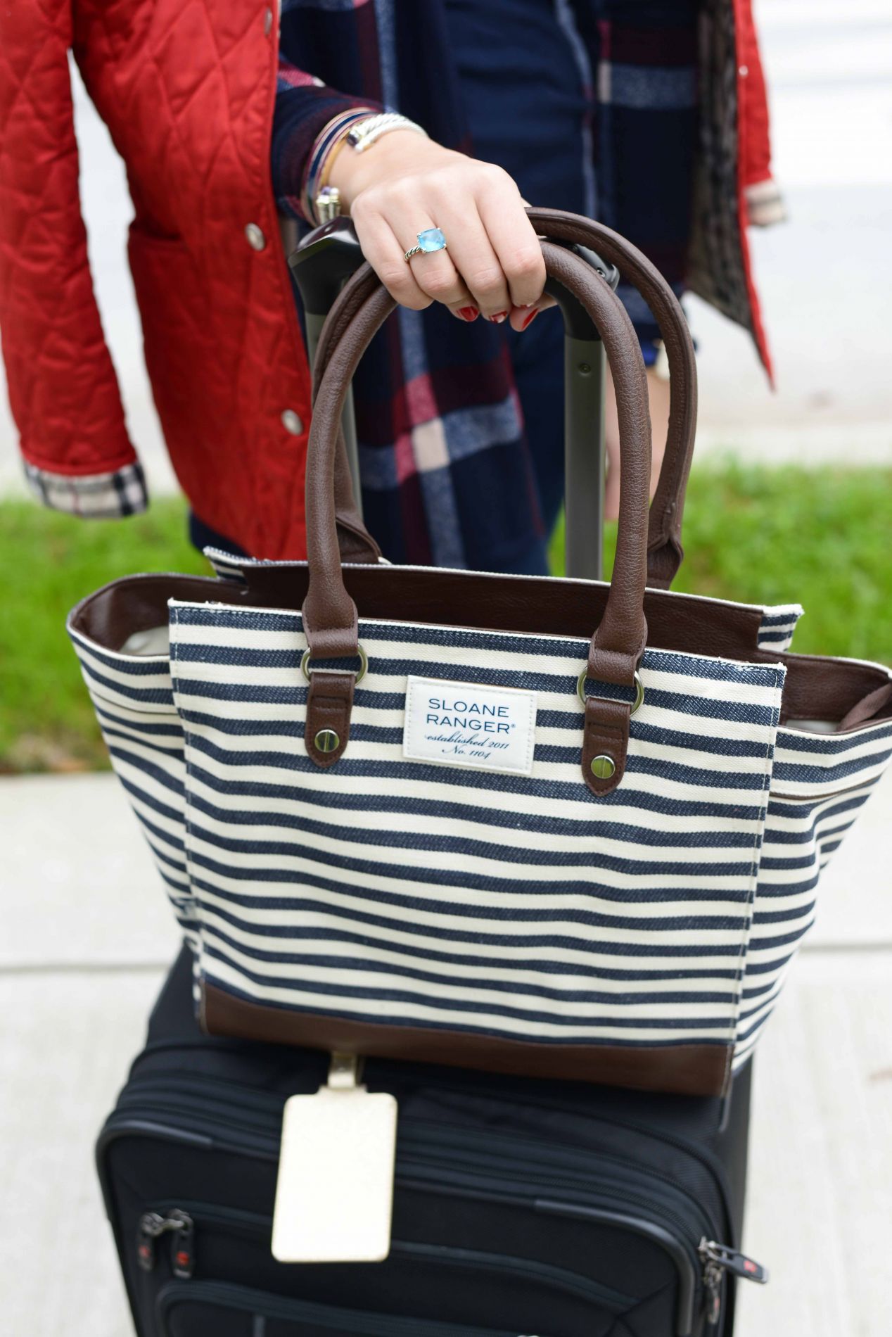 Jacket: Burberry (old; button front version here) // Sweater: Sun and Moon via Pomp & Circumstance boutique // Tee: Gap // Jeans: Joe’s // Flats: Chloe // Tote: Sloane Ranger c/o // Suitcase: Victorinox // Earrings: Saks (similar) // Bracelets: David Yurman cuff, Yurman cable classics pearl bracelet; Sloane Ranger c/o // Watch: Daniel Wellington // Ring: David Yurman