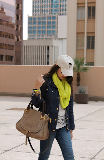 J.Crew Downtown Field Jacket // J.Crew Bon Voyage tee // Gap knit infinity scarf // Gap Always Skinny skimmers // Jack Purcell sneakers // San Francisco Giants hat // Chloe Marcie Satchel // Ray-Ban aviators // Lee Brevard earrings // Initial Reaction monogram necklace // Emily Kammeyer triple wrap tassel bracelet // David Yurman amethyst and pearl cuffs // Six Degrees hair tie // Michele Mini Urban watch