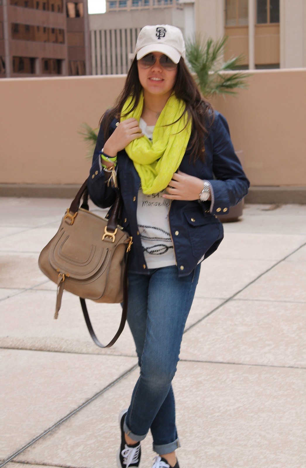 J.Crew Downtown Field Jacket // J.Crew Bon Voyage tee // Gap knit infinity scarf // Gap Always Skinny skimmers // Jack Purcell sneakers // San Francisco Giants hat // Chloe Marcie Satchel // Ray-Ban aviators // Lee Brevard earrings // Initial Reaction monogram necklace // Emily Kammeyer triple wrap tassel bracelet // David Yurman amethyst and pearl cuffs // Six Degrees hair tie // Michele Mini Urban watch