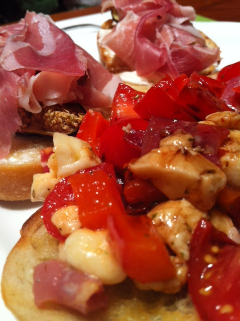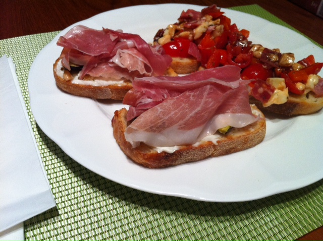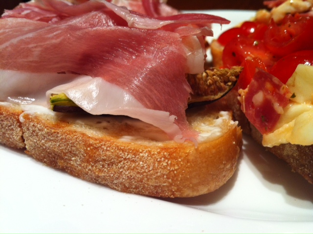 Inspired by one of my favorite places back home in Phoenix Postino, this always busy wine bar also specializes in absolutely delicious bruschetta. On the left is my version of the dried fig, prosciutto + mascarpone bruschetta. I purchased fresh figs, halved them and dried them on a foil covered cookie sheet for about an hour. With the oven door propped open, some dried quicker than others. I brushed some olive oil on my bread slices, grilled them on a panini press then spread the cheese, added three figs and topped with prosciutto.