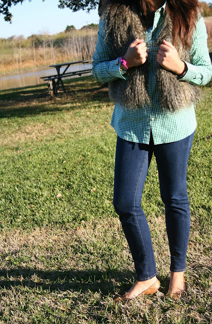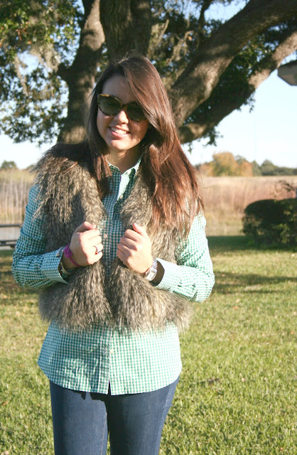 My faux fur vest has been a constant winter staple in my wardrobe since I bought it last year. It’s a rather chic way, in my opinion, to dress up an otherwise casual button down and jeans. Loving my new Alimonada knot bracelet, at such a great price each of their pieces are handmade and part of their profits go to a great cause. Almost done with my crazy week, just one more final to go (meaning a potential all-nighter this evening… oh the joys of college) until I’m officially on Christmas break tomorrow afternoon!