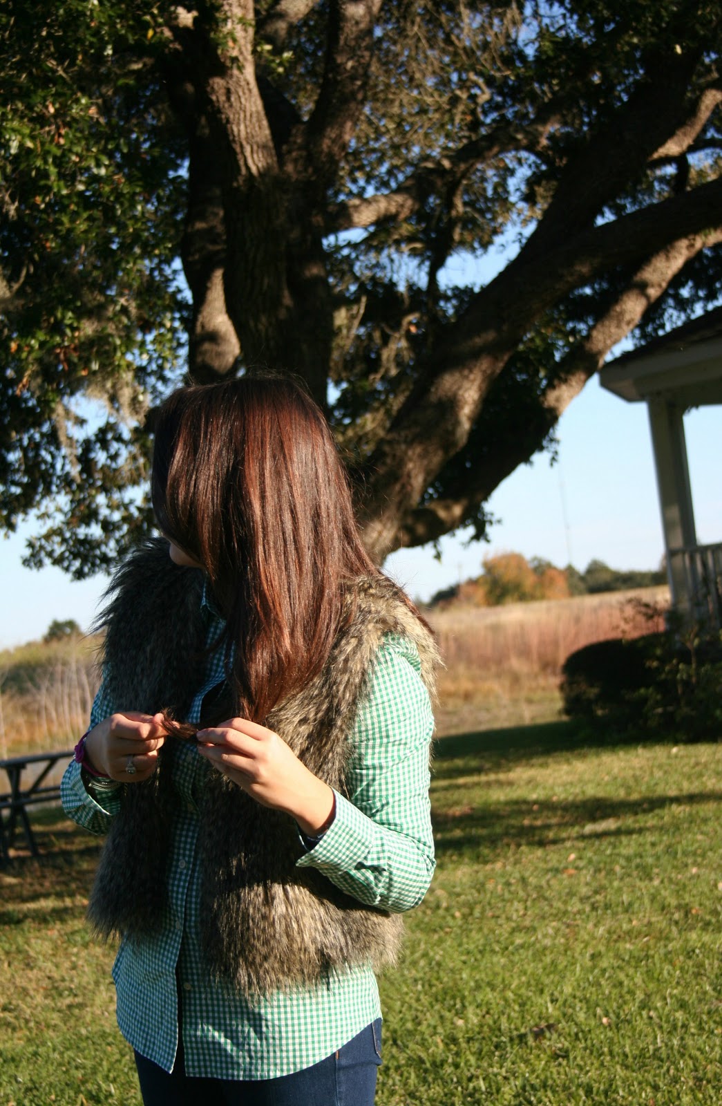 My faux fur vest has been a constant winter staple in my wardrobe since I bought it last year. It’s a rather chic way, in my opinion, to dress up an otherwise casual button down and jeans. Loving my new Alimonada knot bracelet, at such a great price each of their pieces are handmade and part of their profits go to a great cause. Almost done with my crazy week, just one more final to go (meaning a potential all-nighter this evening… oh the joys of college) until I’m officially on Christmas break tomorrow afternoon!